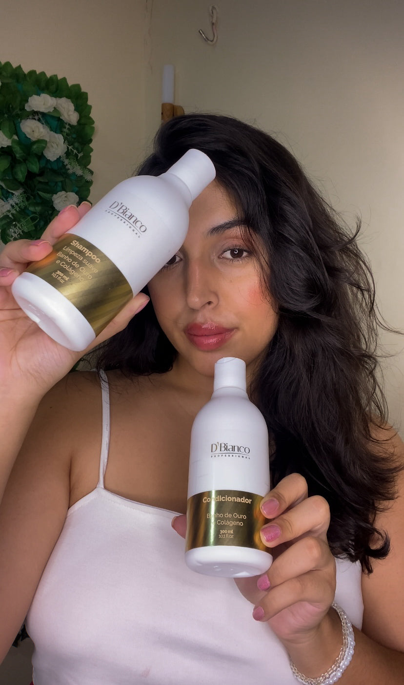 O Kit D’Bianco Banho de Ouro reúne shampoo e condicionador para proporcionar uma rotina de cuidado luxuosa e resultados de salão em casa. O Shampoo Banho de Ouro realiza uma limpeza suave que remove impurezas sem ressecar, devolvendo luminosidade e leveza aos fios. O Condicionador Banho de Ouro hidrata profundamente, sela as cutículas e restaura a elasticidade, garantindo maciez, brilho e toque aveludado.